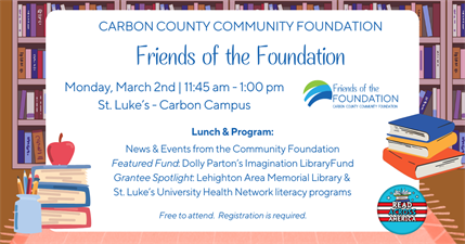Join us for our quarterly Friends of the Foundation lunch on Monday, March 2nd from 11:45 am - 1:00 pm in the Education Room at St. Luke's Hospital - Carbon Campus.